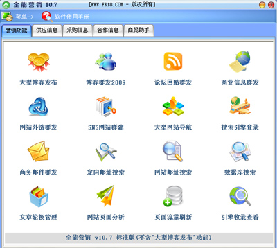 全能營銷10.7是一體化網絡營銷軟件,集成了最有效的信息發布功能。使用本軟件無需豐富的網絡知識,業務不用跑,訂單送上門。只需要短短兩周時間,即可讓你的信息遍布各大搜索引擎,并且效果長久有效。迅速覆蓋大型商貿網站、大型論壇網站、門戶博客網站、企業黃頁網站、B2B電子商務網站、分類信息網站、行業論壇網站、企業博客網站、目標客戶郵箱。軟件平均每個月升級一次,增加最新數據庫、不定期擴展支持更多類型網站,正式會員可以免費升級!