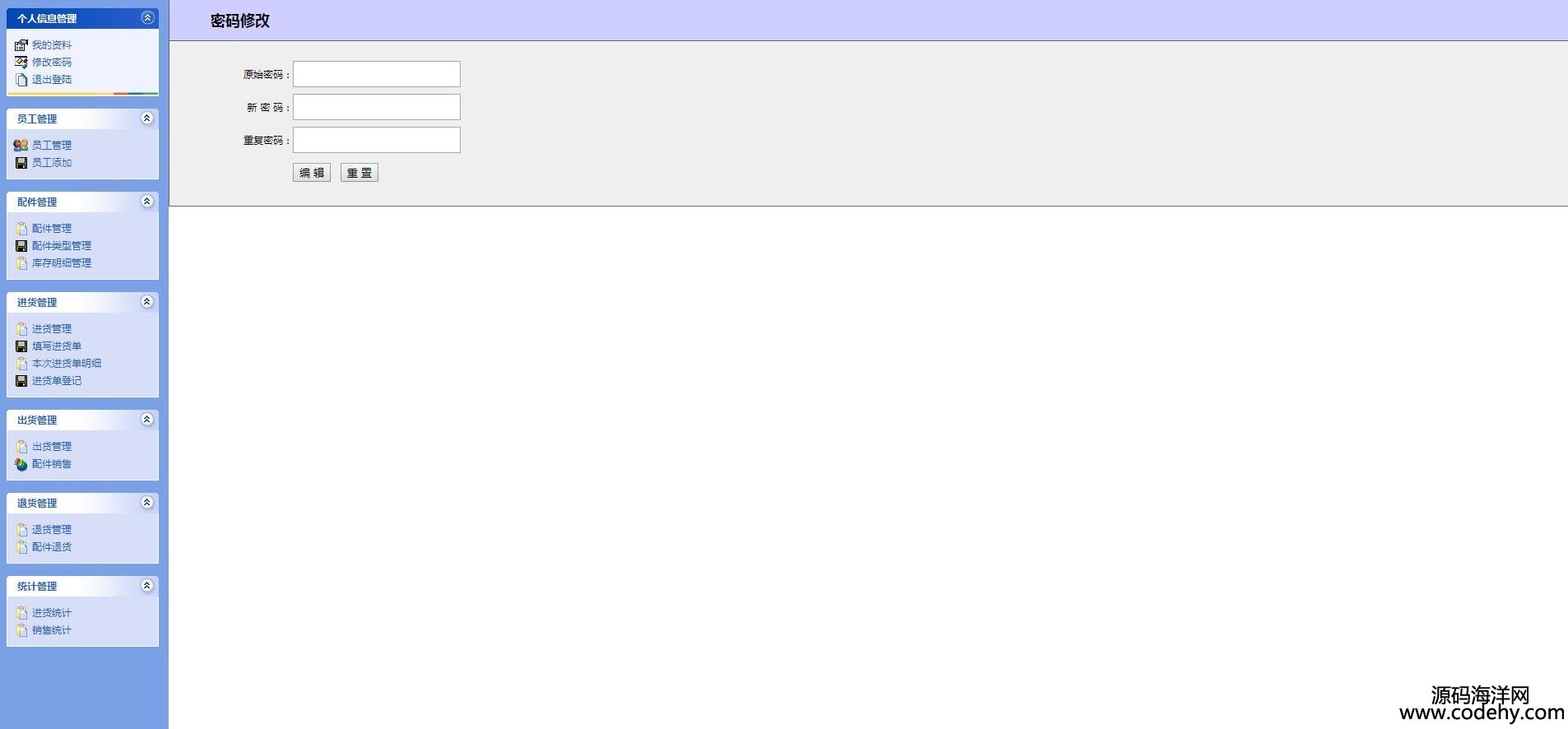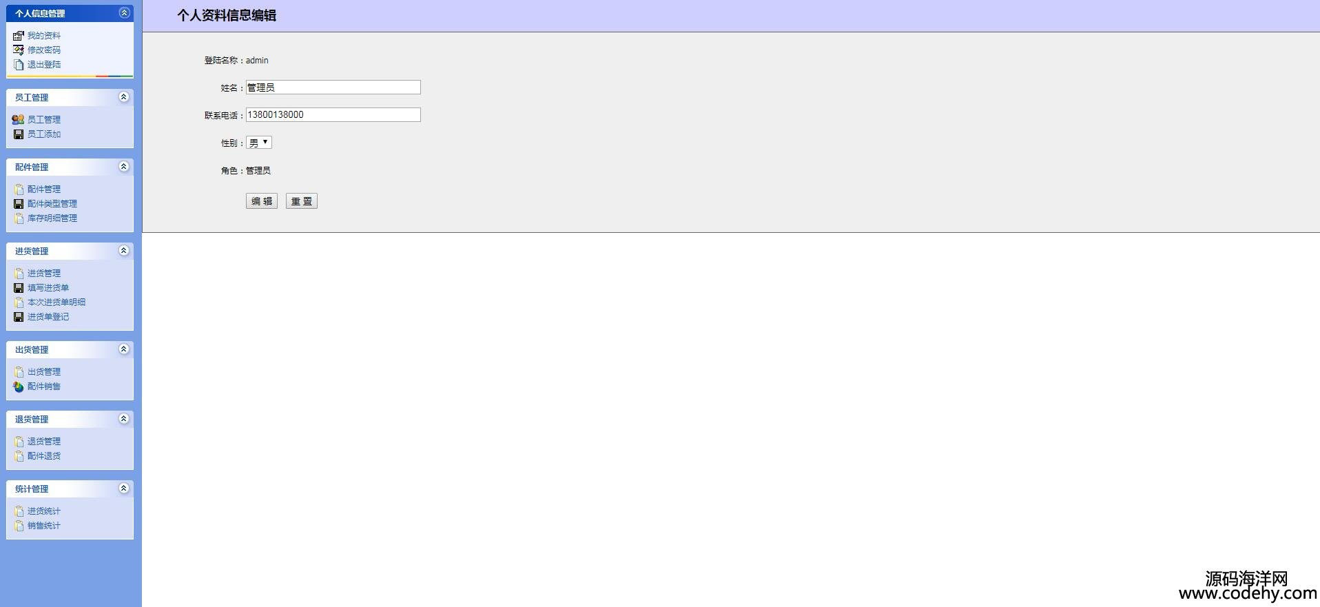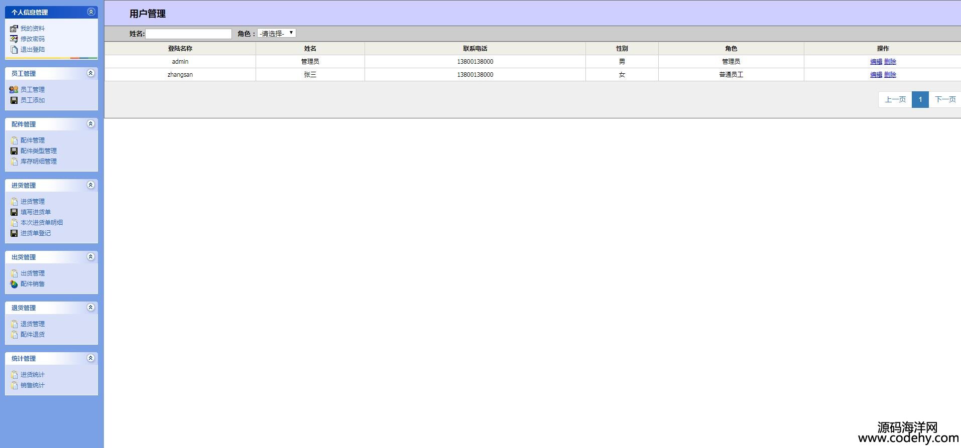 本系統(tǒng)用戶主要分普通員工和管理員,管理員主要是增加了一些管理操作,普通員工主要是面向客戶的操作。其主要模塊包括:配件銷售、配件退還、庫(kù)存查看、客戶信息錄入、用戶管理、配件類型管理、配件信息管理、庫(kù)存更新和利潤(rùn)統(tǒng)計(jì)。