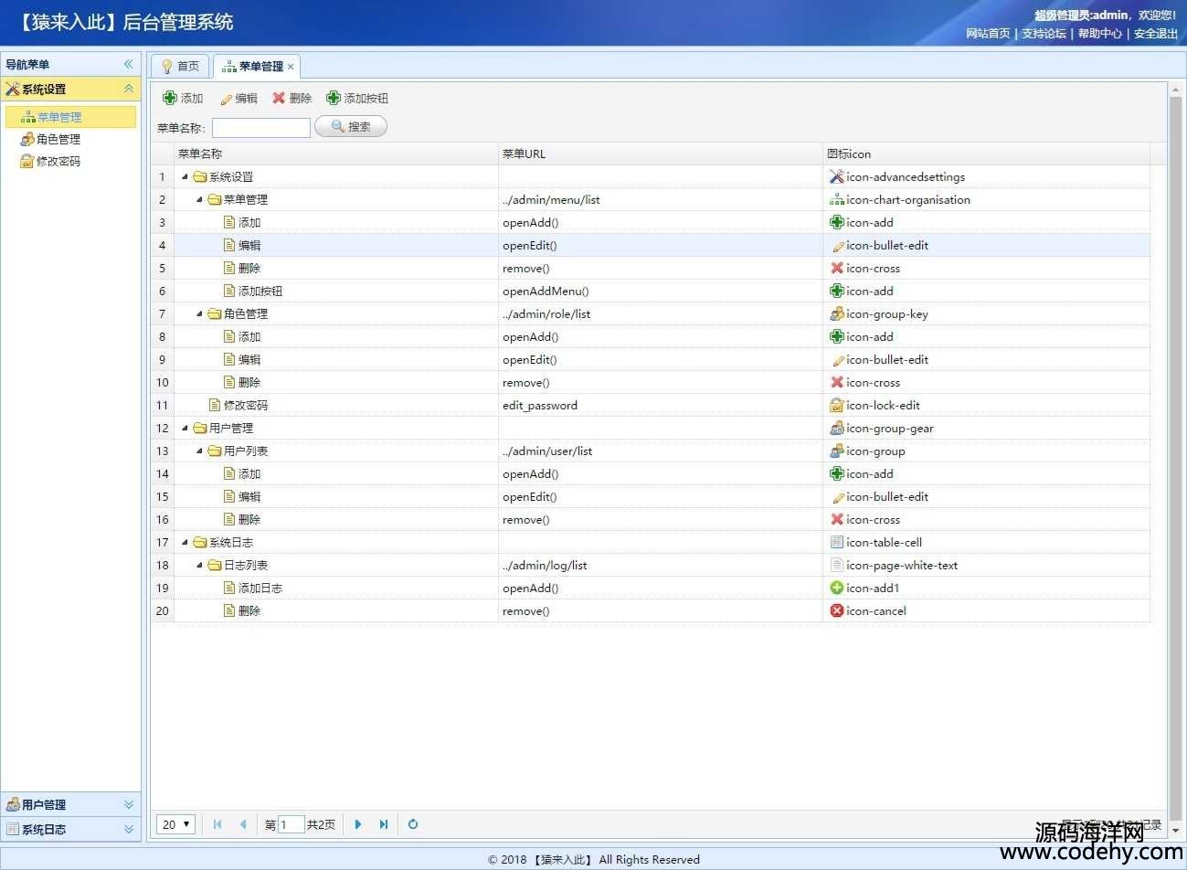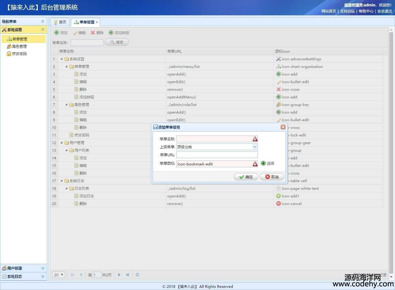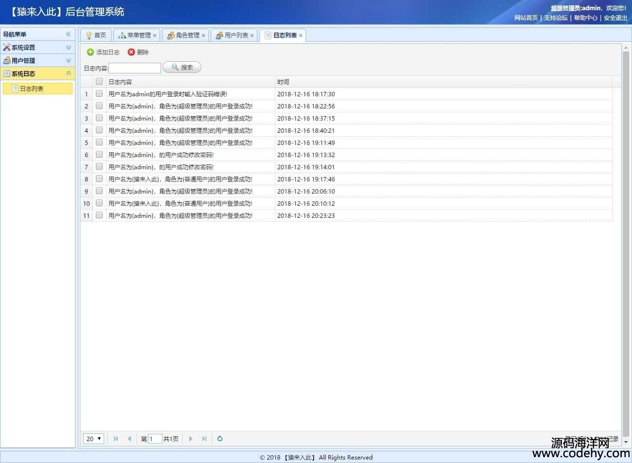 2.本系統主要實現的功能有:菜單管理、角色管理、用戶管理、日志管理,不同的角色分配相應的權限,用戶分配不同的角色登錄后顯示相應被分配的功能。
