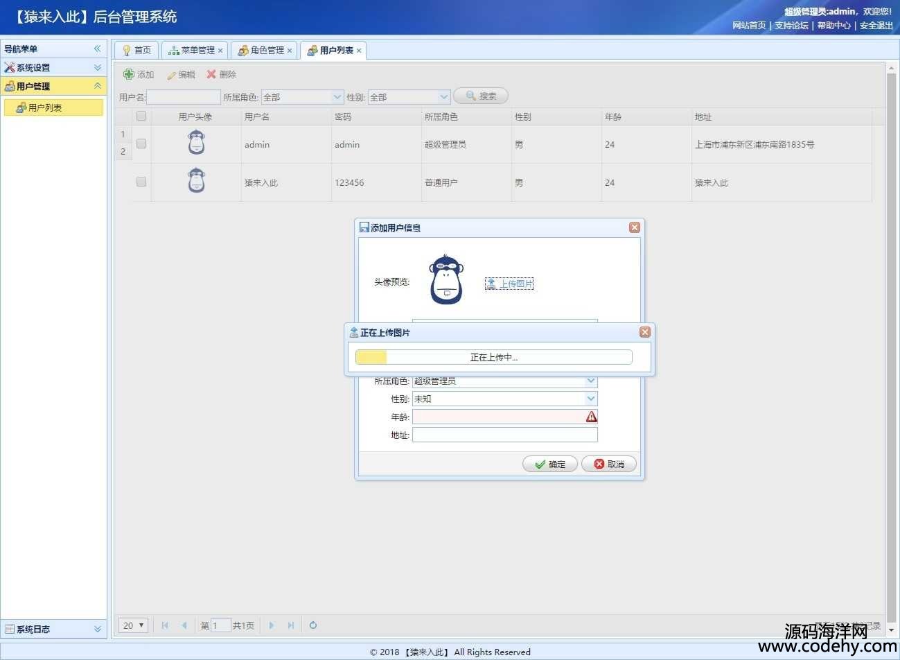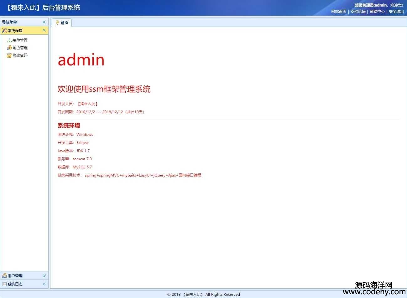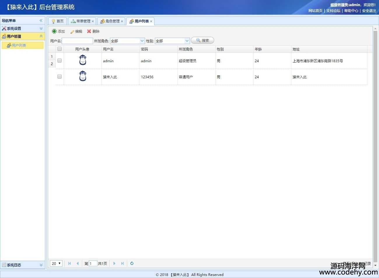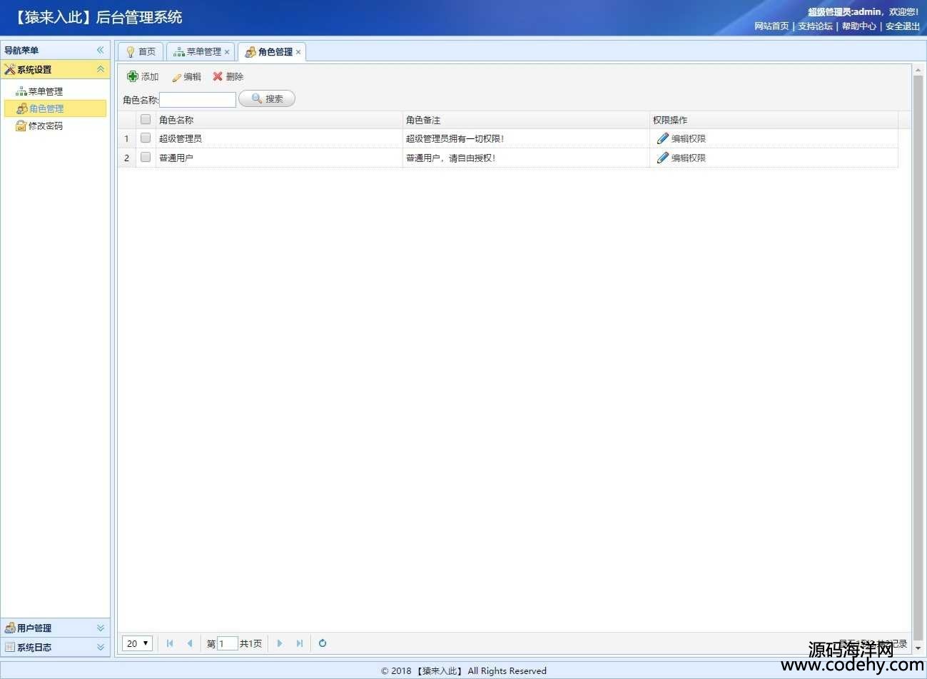 2.本系統主要實現的功能有:菜單管理、角色管理、用戶管理、日志管理,不同的角色分配相應的權限,用戶分配不同的角色登錄后顯示相應被分配的功能。