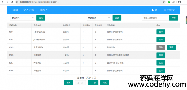 查詢排課情況、根據老師姓名/學院篩選、進行選課、查詢個人選課情況、查詢成績