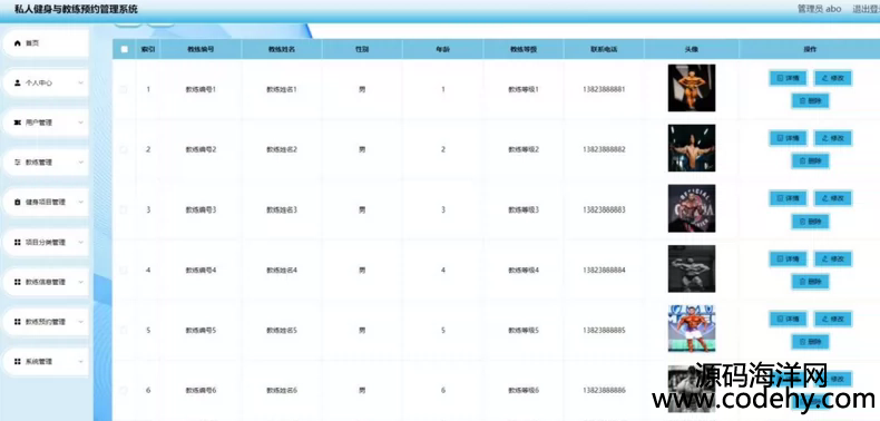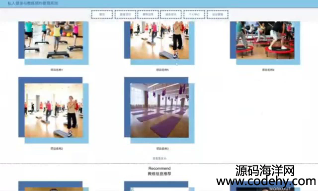 模塊:首頁、個人中心、用戶管理、預約管理、項目信息管理、教練分配管理、健身信息管理