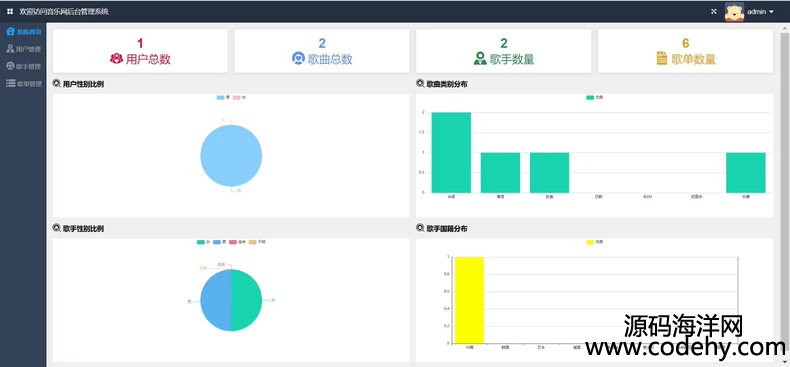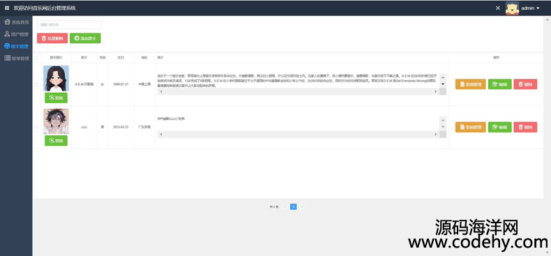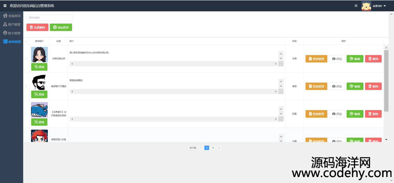 ③:管理員模塊:用戶管理、歌手管理、歌單管理、上傳歌曲