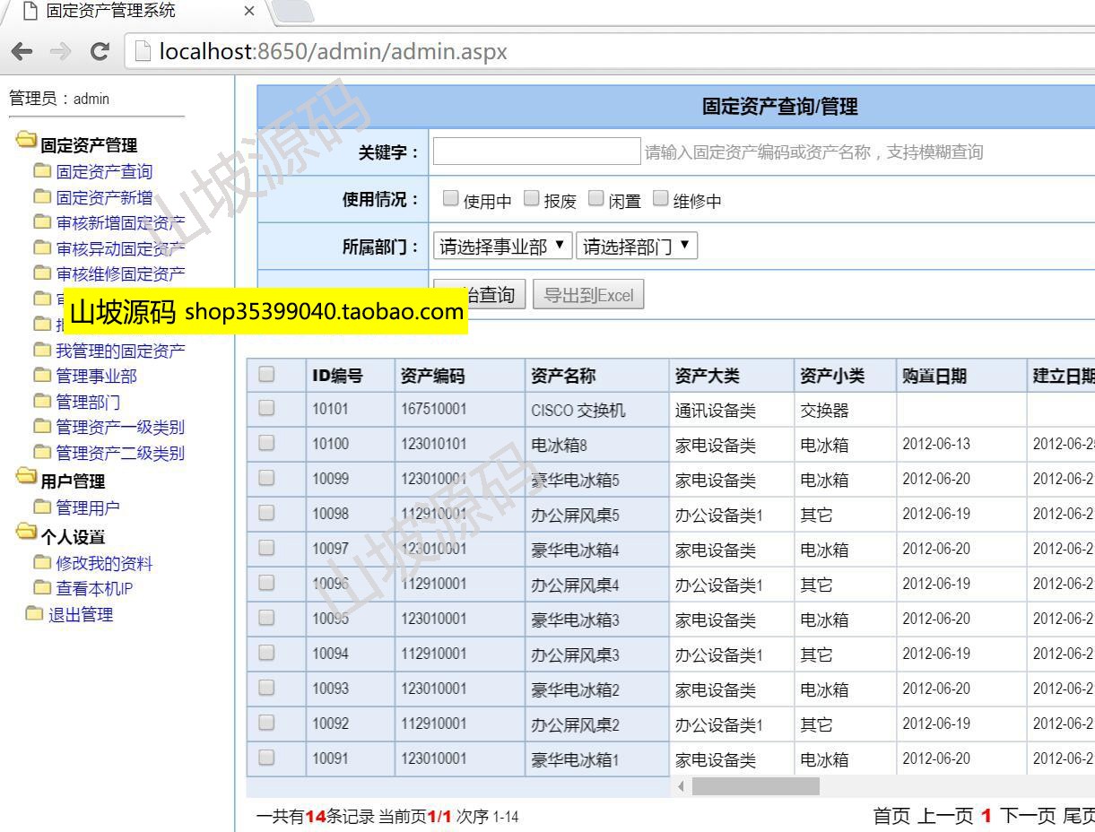 1)固定資產查詢/管理(由于列數比較多,采用固定前面4列的方式,后面的列可拉動橫向滾動條),點擊查看打印列表,