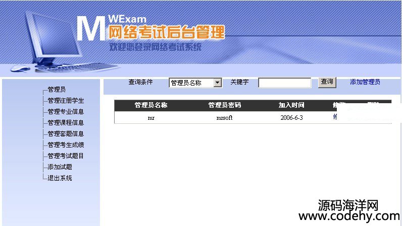 后臺主要包括:管理員、管理注冊學生、管理課程信息、管理套題信息、管理考生成績、管理考試題目、添加試題。其中管理員、管理注冊學生、管理課程信息、管理套題信息、管理考生成績、管理考試題目的操作方法相同,下面以管理員為例,講解其操作方法。