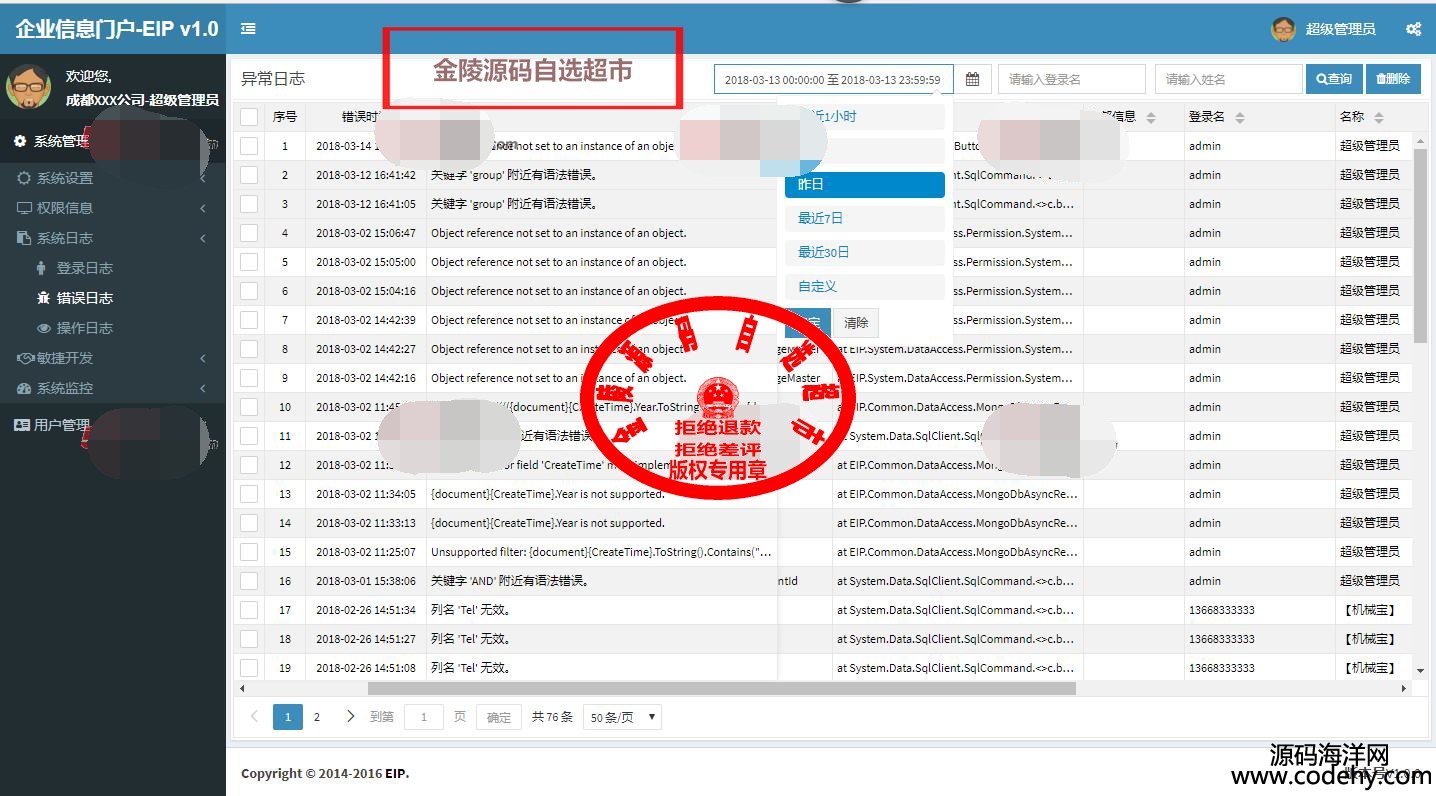 3、完善的日志:全方位的記錄日志。日志包括:登錄日志、操作日志、數據日志、訪問日志、異常日志。可快速定位到系統中每一個