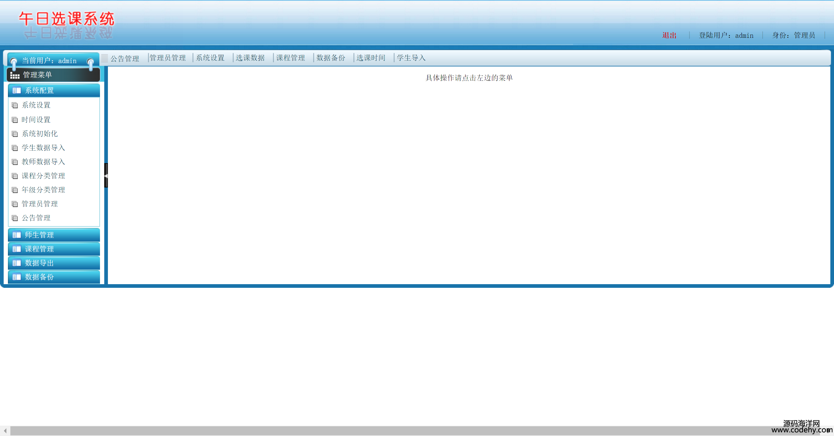 1、實現學生多門選課,退選,管理員課程添加,學生、老師數據導入,選課數據導出等選課常用的功能。投入實際使用,反響不錯的哦。
