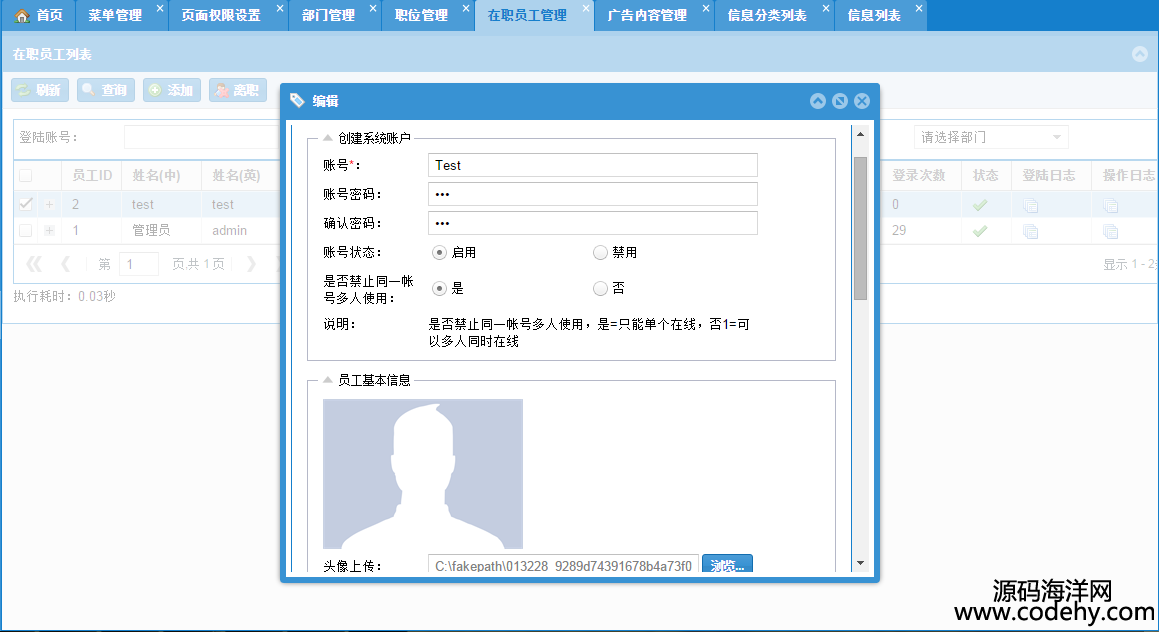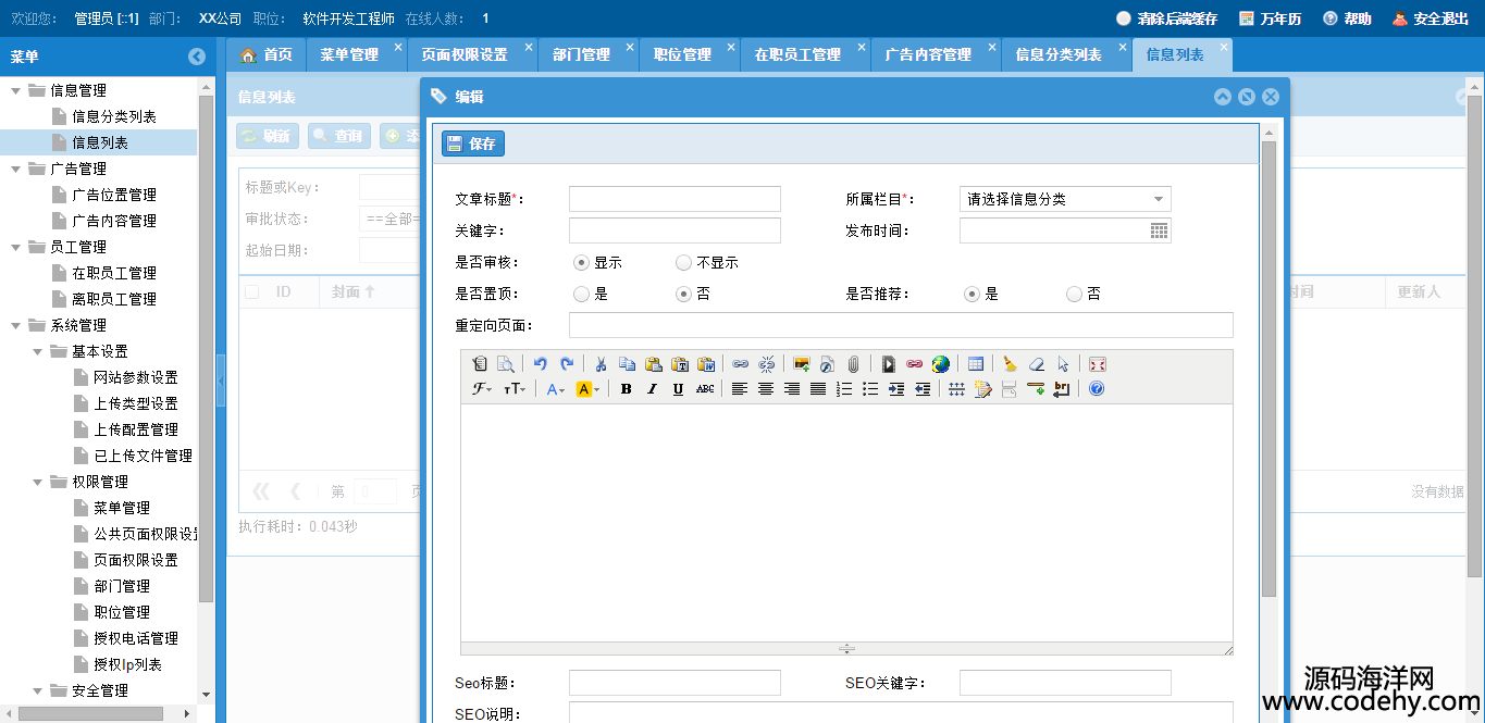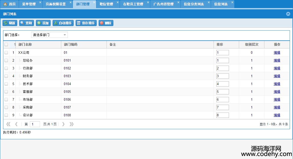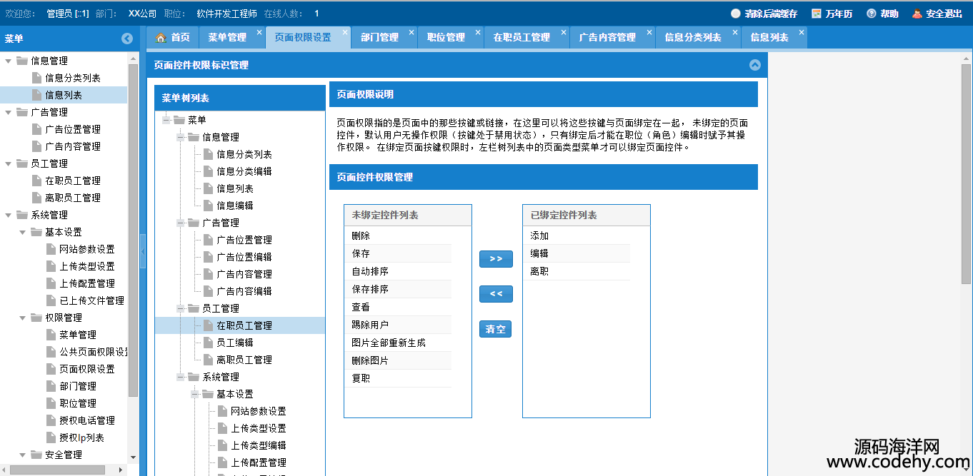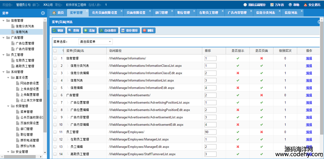 已上傳文件管理)、權限管理(菜單管理、公共頁面權限設置、頁面權限設置、部門管