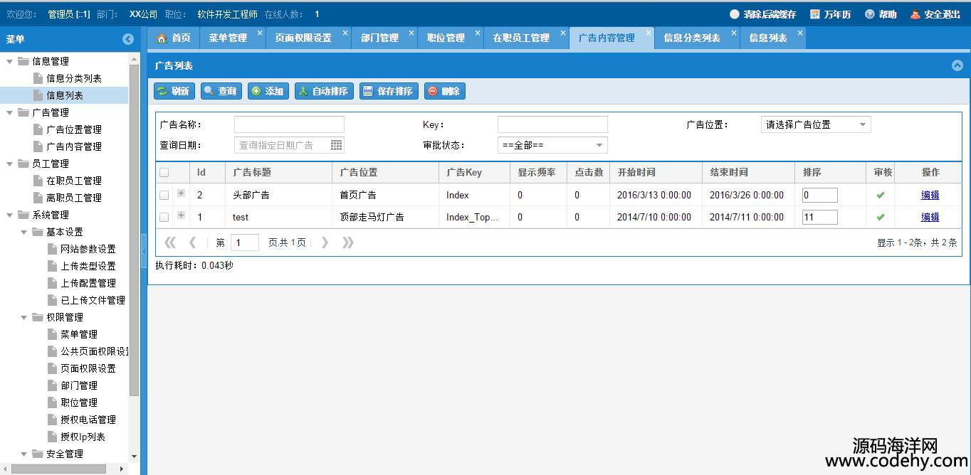 2、廣告管理:廣告位置管理、廣告內容管理。