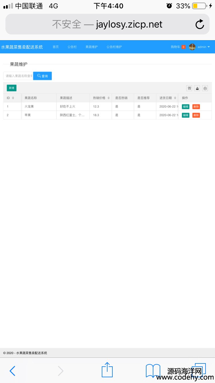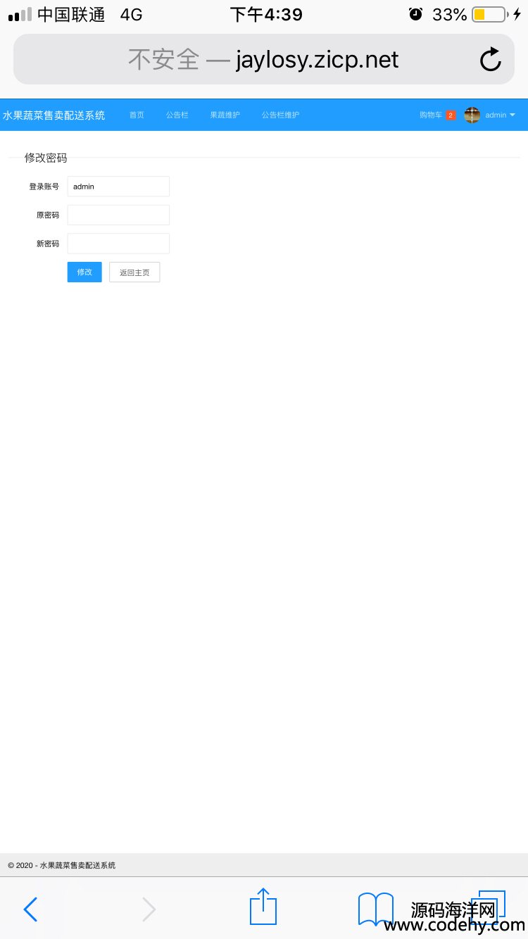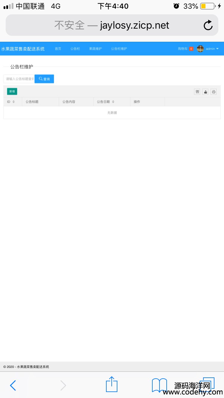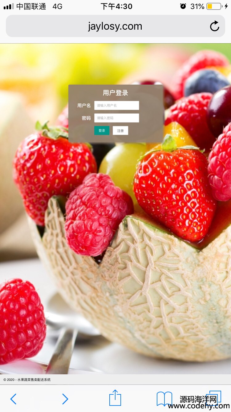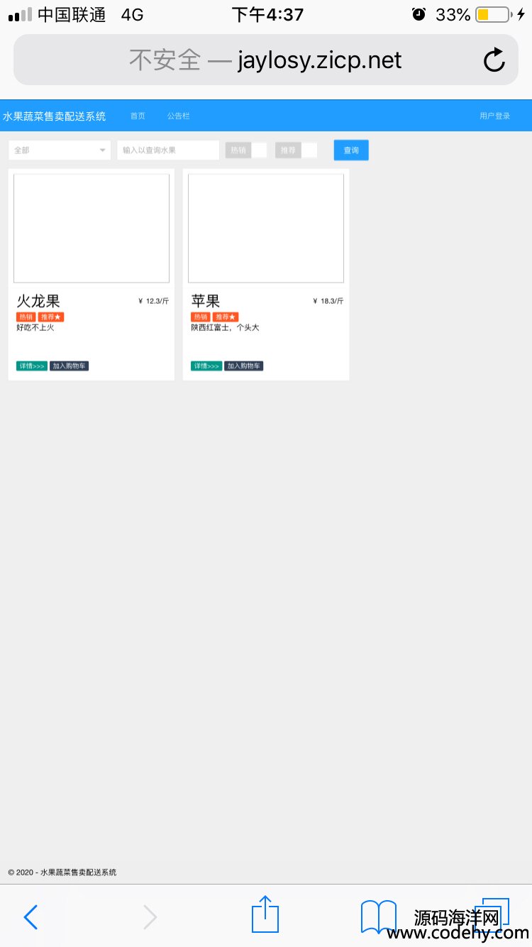 c# asp.net水果蔬菜售賣配送系統(tǒng)(購物商城)。包含用 戶登錄,注冊,購物車,結(jié)算,訂單,評價,商品信息,圖片上傳及公告欄。軟件包含源代碼和數(shù)據(jù)庫腳本。理論上支持vs2010和數(shù)據(jù)庫sql server2008。前端框架采用layui。權(quán)限包含系統(tǒng)管理員和客戶。管理員有所有權(quán)限。客戶只有查看商品頁,購物,查看訂單,查看公告欄,修改密碼等權(quán)限。