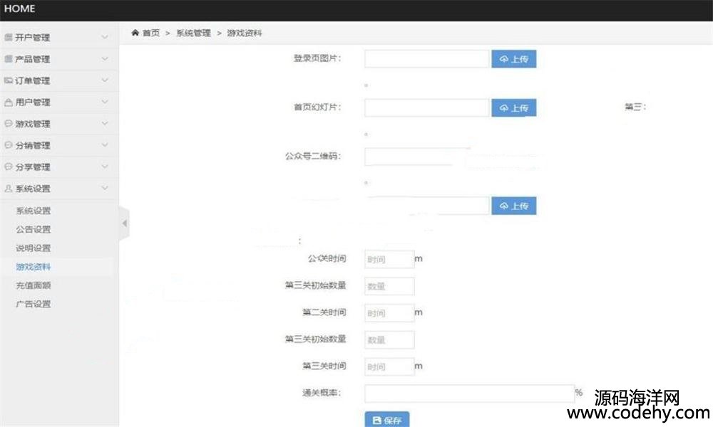 游戲資料,登錄首圖,首頁幻燈片,公眾號二維碼,背景音樂,充值面額,廣告設置)
