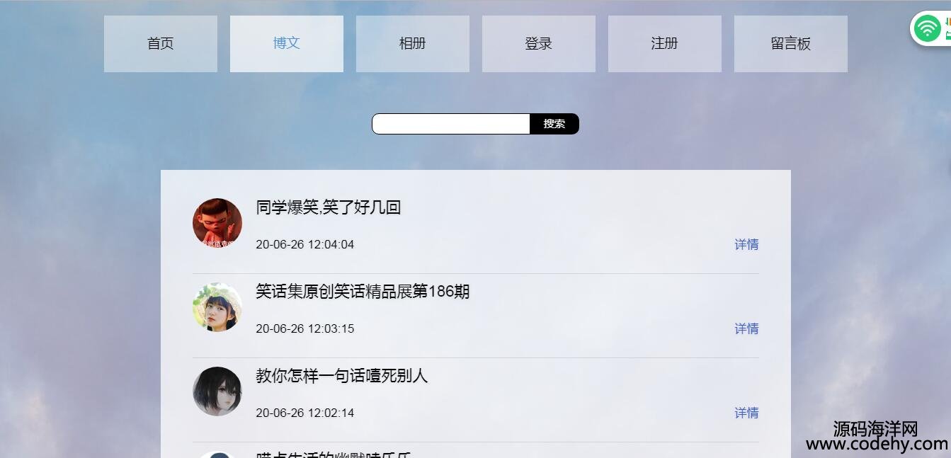 首頁,站長信息展示,博客分頁展示,博客詳情,博客搜索,相冊分頁展示,圖片預覽,登錄,注冊,退出,給站長留言