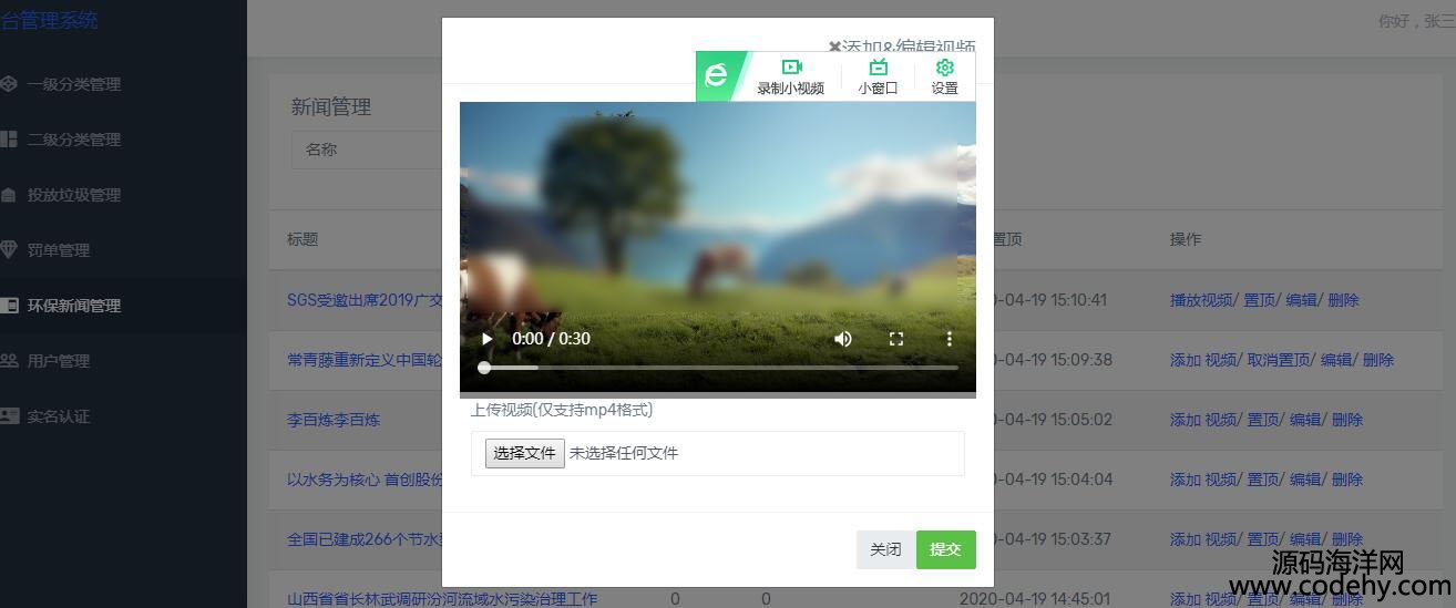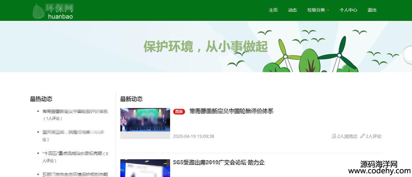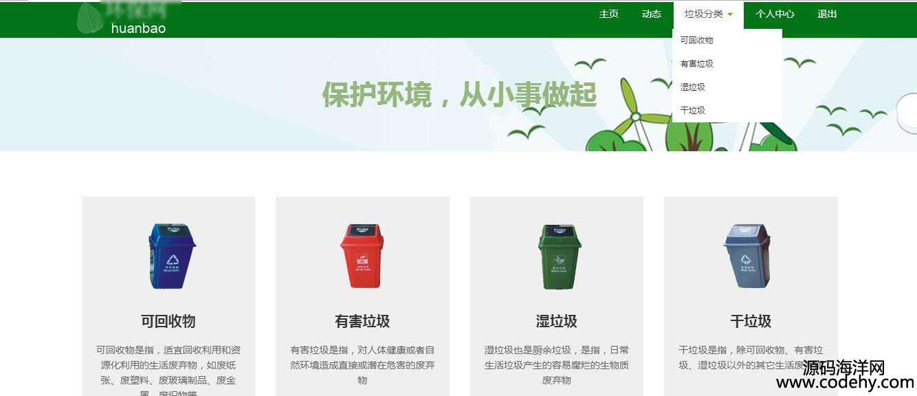 功能:環保主題首頁,環保新聞(瀏覽量,置頂,評論量,最新新聞,熱門新聞),圖文信息,視頻播放,評論,刪除評論,垃圾分類介紹,垃圾投放記錄信息展示