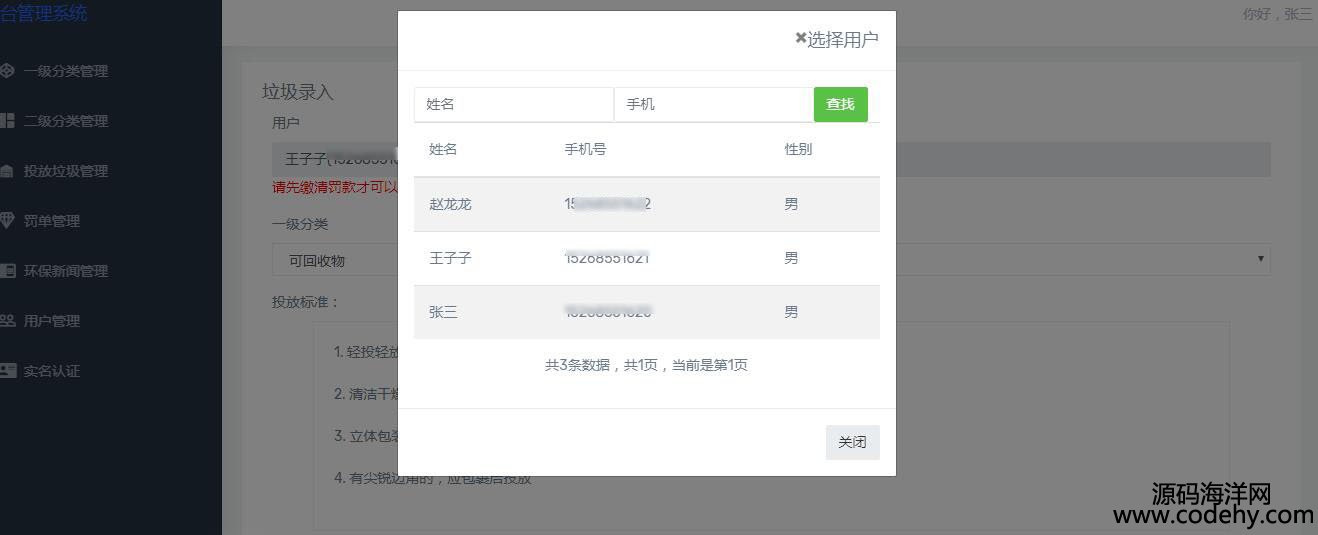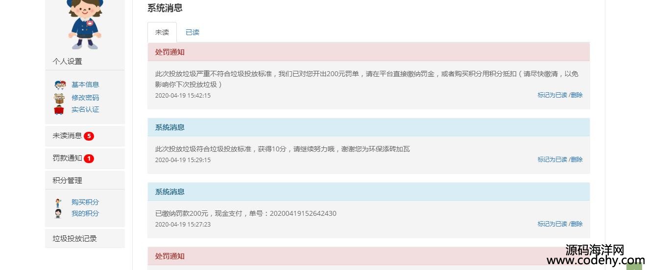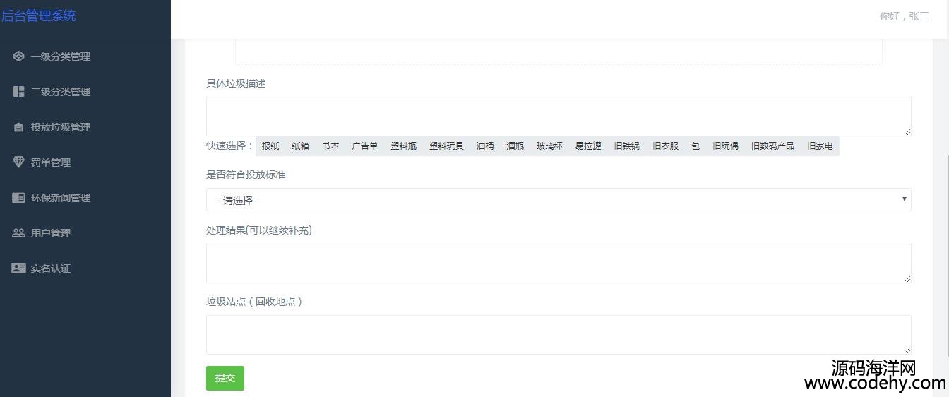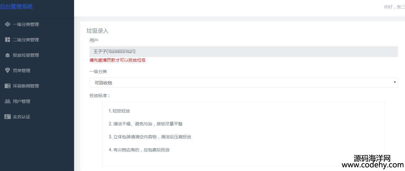 管理員后臺:登錄,修改密碼,修改個人基本信息,實名認證,垃圾一級分類,垃圾二級分類,垃圾錄入(符合投放標準加10積分,警告不加分,不符合直接扣200積分,若積分不夠,產生一個200元的罰單,用戶可以通過管理員現金支付或者掃碼支付罰單,也可以自己在個人中心購買積分抵扣或者掃碼支付),如果用戶不繳納罰款,則不能錄入垃圾投放記錄,新聞管理(圖文混排,視頻上傳),可以置頂操作,用戶管理,實名認證審核
