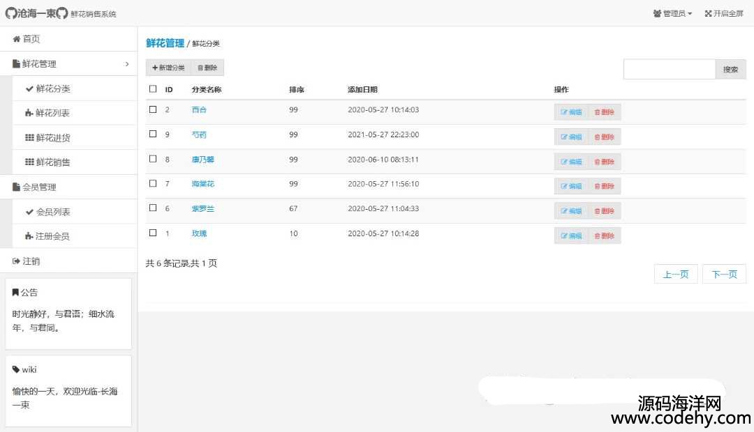 2、鮮花分類管理: 添加鮮花的分類、修改分類、刪除分類、查詢分類列表