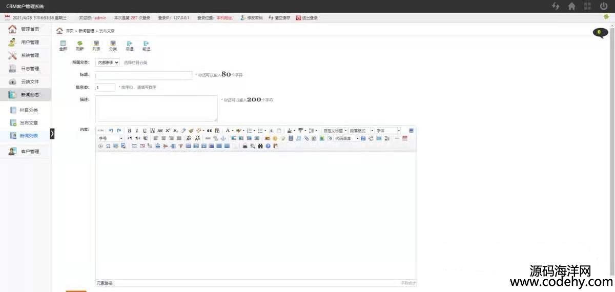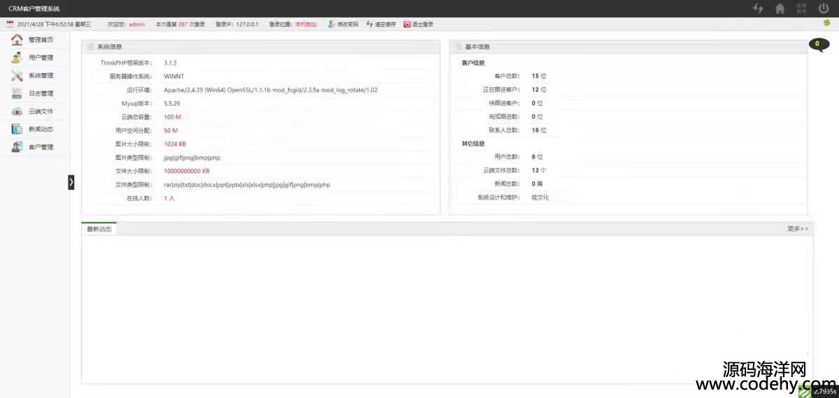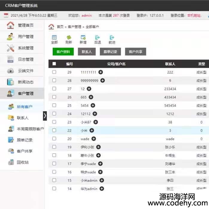 CRM客戶管理系統開源客戶關系資料管理網頁版系統如圖,完整版是能顯示ip和地區的
