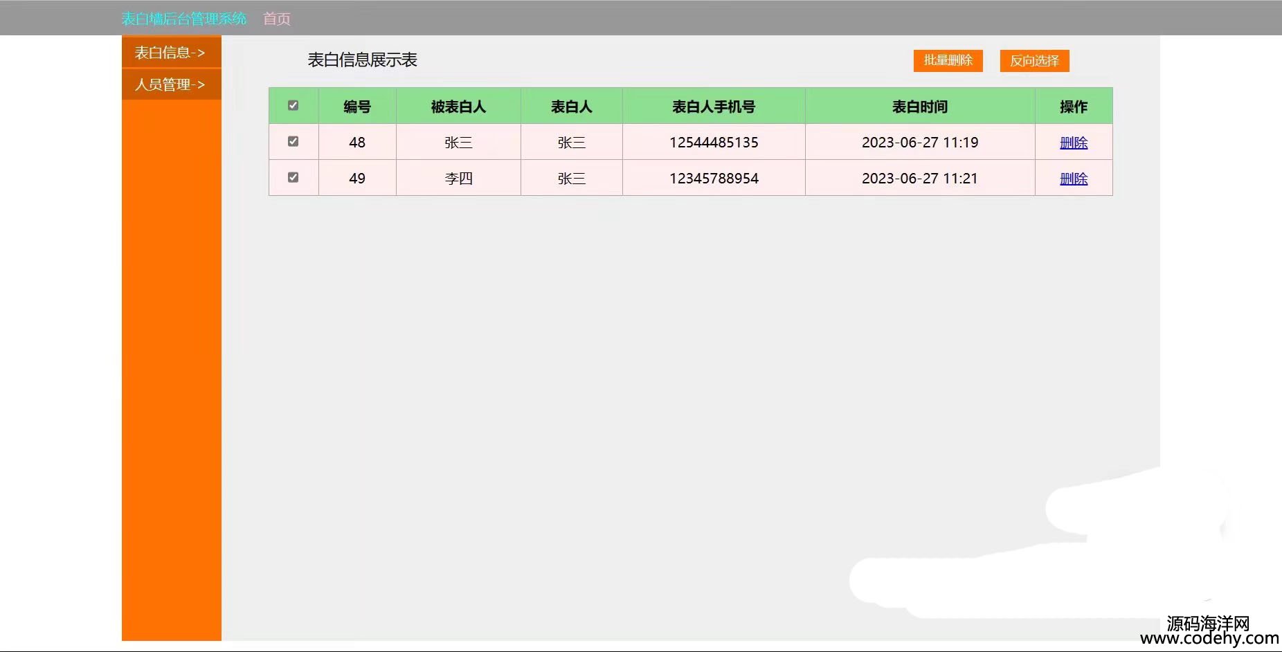 2.表白信息管理,單選多選,批量刪除