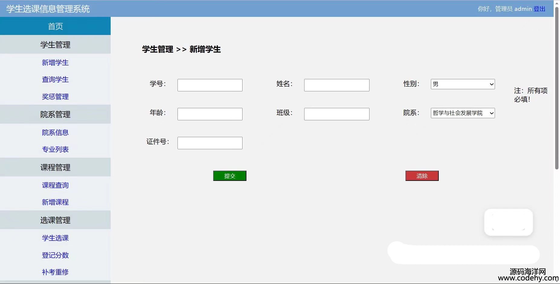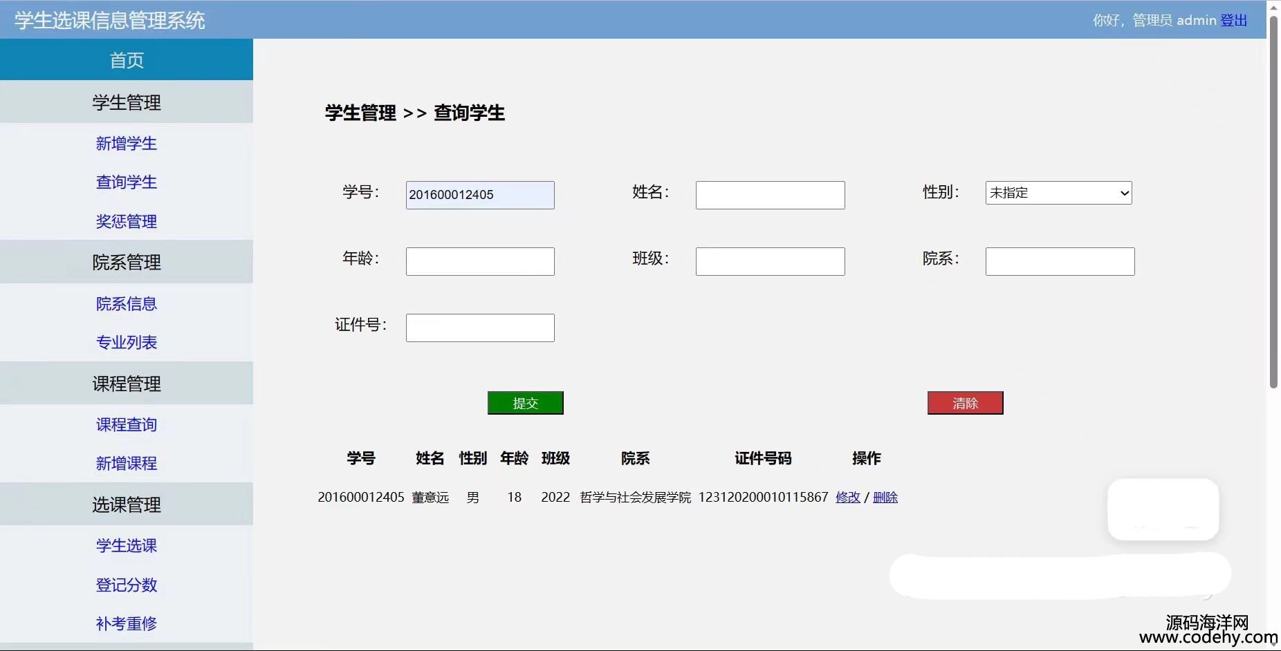 管理員能夠對:學生管理(基本信息+獎懲),院系管理,課程管理,選課管理(學生選課、登記、補考重修)