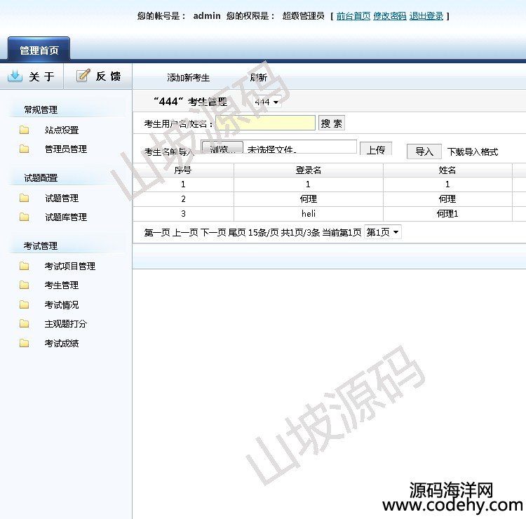 2:可以根據帳號作弊,在后臺登錄狀態下,在后面加上參數?abc=1時候出現,考生了字樣,選擇在里面添加上要作弊的帳號(考生登錄名)即可,然后前臺按“z” 鍵 單選題,多選題,判斷題全部變成正確答案。